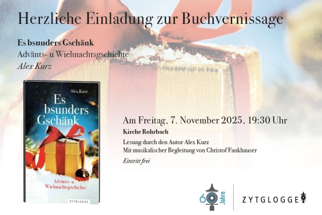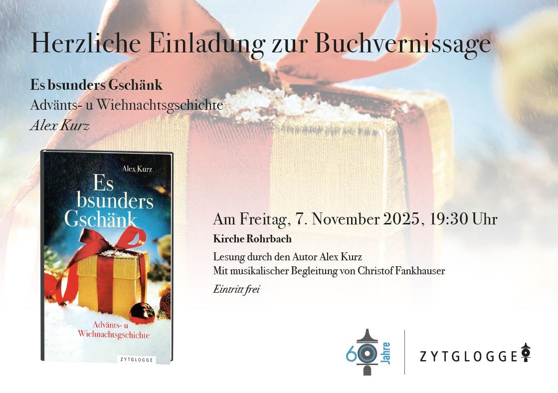 Bei der Vernissage am Freitag, 7. November 2025, liest Alex Kurz aus dem Büchlein vor, Christof Fankhauser wird sie musikalisch umrahmen, «er ist unser Kirchenmusiker und ein kreativer Kopf, mit dem ich gerne zusammenarbeite. Anschliessend gibt es ein gemütliches Zusammensein, einen Büchertisch, wo man das Büchlein – und auch die anderen Bücher – kaufen kann. Wenn man will, kann man es signieren lassen und als besonderes Weihnachtsgeschenk mit nach Hause nehmen.»
